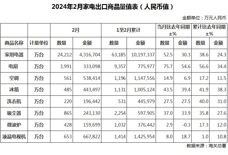 - 海關總署數據顯示,2024年2月中國出口家用電器24,212萬臺,同比增長52.5%;1-2月累計出口63,185萬臺,同比增長38.6%。 具體來看,2月出口空調561萬臺,同比增長14.9%;1-2月累計出口1,196萬臺,同