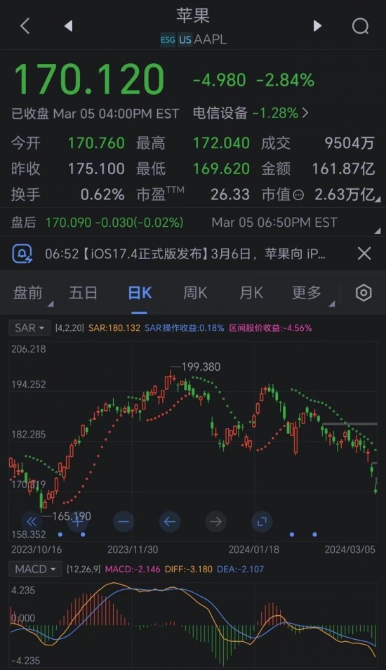 - 隔夜,蘋果、特斯拉繼續大幅回調,令美股大盤承壓 。蘋果收盤下跌2.84%,連續5個交易日下跌。消息面上,市場調研機構Counterpoint Research數據顯示,今年前六周,蘋果公司在中國的iPhone銷量同比