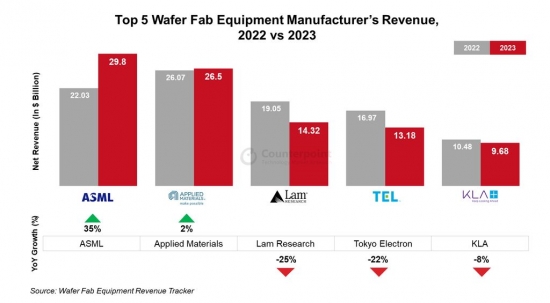 - ASML領銜,2023年五大晶圓廠設備制造商收入935億美元
