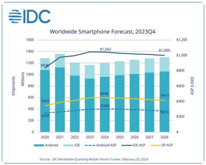 - IDC 近日發布市場研究報告,預估 2024 年全球智能手機出貨量將達到 12 億部,同比增長 2.8%,隨后到 2028 年將保持較低的個位數增長。 IDC 認為 2024 年總體出貨量仍低于大流行前的水平,但