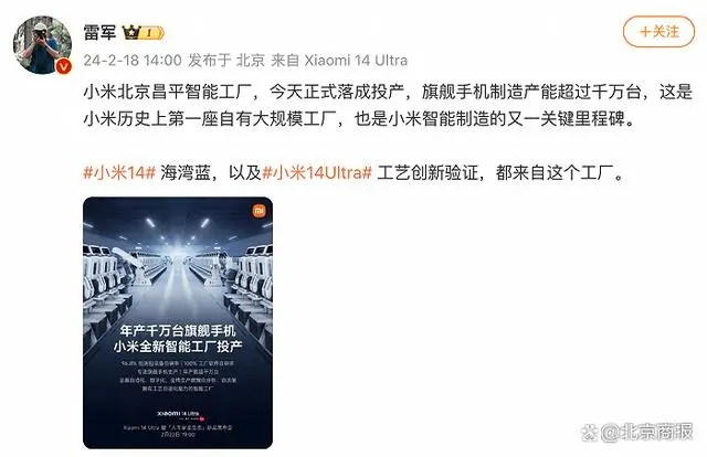 - 2月18日,雷軍發(fā)文稱,小米北京昌平智能工廠今日正式落成投產(chǎn),旗艦手機(jī)制造產(chǎn)能超過(guò)千萬(wàn)臺(tái),這是小米歷史上第一座自有大規(guī)模工廠,也是小米智能制造的又一關(guān)鍵里程碑。