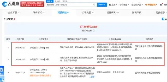 - 天眼查App顯示,近日,戴森貿(mào)易(上海)有限公司因扣繳義務(wù)人不履行代扣代繳義務(wù),應(yīng)扣未扣、應(yīng)收而不收稅款,以及不進(jìn)行納稅申報(bào),不繳或者少繳應(yīng)納稅款,分別被國(guó)家稅務(wù)總局上海市黃浦區(qū)稅務(wù)局罰款