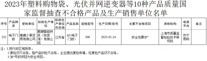 - 近期,市場監管總局組織塑料購物袋、光伏并網逆變器等10種產品質量國家監督抽查。此次共抽查檢驗1813家生產單位、479家銷售單位的1817批次產品,發現不合格產品232批次。其中,1批次電子門鎖