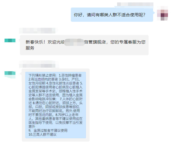 實際上,頸部按摩儀對于一些特定人群是不適用的,包括有惡性腫瘤的患者、有出血傾向的患者、孕婦、產婦還有三高患者,這些都不建議使用。不過值得一提的是,筆者查看了在激動銷量前幾的頸部按摩儀,再其產品詳情頁都沒有明顯的關于不適用人群的標識,只有詢問客服才會告知。