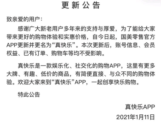 【劃重點】: 兩年兜兜轉轉,國美還是選擇了再改一次名。 根據蘋果商店版本歷史記錄顯示,近期國美線上電商平臺“真快樂”app發布了新版本,除了常規的修復bug、優化產品體驗之外,最大的改變